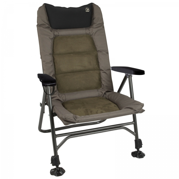 Comfortabele stoel met twee verstelbare poten aan de voorkant, met robuuste met suède beklede zitting en rugleuning voor optimaal comfort en een bekerhouder in de armleuning.Â