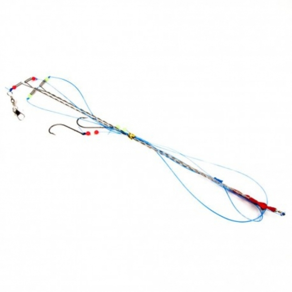 De Gul Onderlijn Skelterboom van Midnight Moon is een 2-haaks onderlijn met 2 Metalen Skelterboom afhouders van 30 cm. De afhouders zijn voorzien van anti-kinkwartel en gekleurde kralen als extra lokker op de haaklijnen.