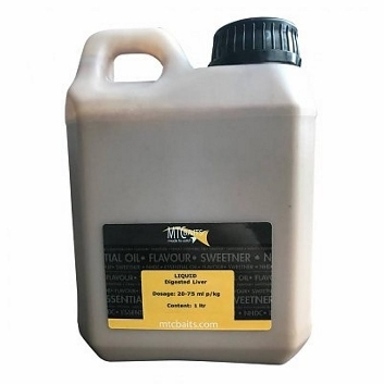 Digested Liver is een vloeibaar leverextract. Het wordt gebruikt in de petfood sector als acceptatieverbeteraar, dat wil zeggen honde- of kattebrokken worden ermee besprenkeld om zodoende de smaak te verbeteren. Hierdoor worden de brokken direct geaccepteerd als voedsel zijnde. Eén van de stoffen omschreven door Howard E. Loeb – een bioloog uit de Verenigde Staten – als karper attractor en daar heeft hij niet over gelogen. Vooral in vismeelrecepturen is vloeibare lever al jaren een betrouwbare factor. Het is rijk aan vitamine B-12 en staat bol van de vrije aminozuren. Deze onverdunde versie wordt gemaakt van maïskippenlevers. Hierdoor heeft de vloeistof een lichtbruine kleur, die karakteristieke leversmaak en penetrante onmiskenbare levergeur. Deze liquid van Mtc Baits word geleverd in een hqndige jerry-can met een inhoud van 1ltr.