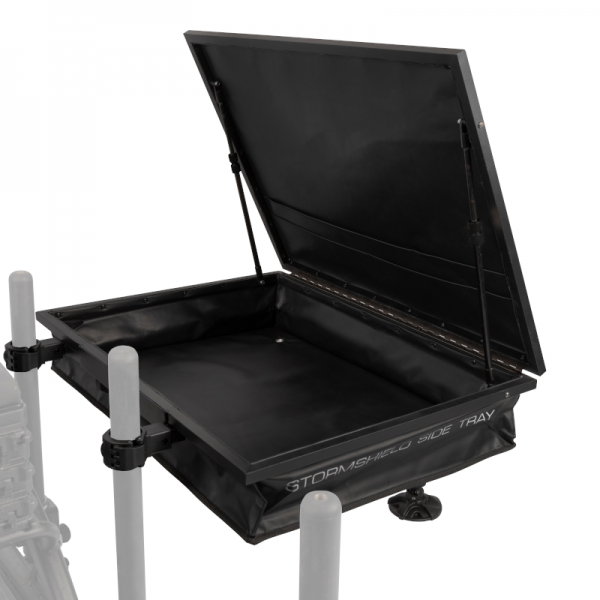 Stormshield Side Trays – Standaard De standaard Stormshield Side Trays is de perfecte keuze voor feedervissers. Dit populaire ontwerp heeft meerdere belangrijke kenmerken waardoor het tot een essentieel product wordt. De Stormshield is voorzien van onze populaire OffBox Clamping Knuckles die ongelooflijk stabiel zijn, zo stabiel in feite dat deze zijtafel niet ondersteund hoeft te worden met een extra poot. Mocht je toch de voorkeur geven aan het gebruik van een extra poot, de zijtafel is voorzien van een kleminrichting die rond een poot geklemd kan worden (wordt niet meegeleverd). De Clamping Knuckles kunnen op elke diameter ingesteld worden zodat ze geschikt zijn voor elke zitkist die op de markt beschikbaar is. De Knuckles worden geleverd met inzetstukken voor een groot aantal verschillende diameters van poten (23, 25, 30 mm of 36 mm zonder insert). De zijtafel biedt veel interne opslagruimte met veel ruimte voor aasdozen of EVA bakken, terwijl de omhoog te zetten deksel eveneens over interne ruimtes beschikt waarin klein materiaal veilig opgeborgen kan worden. De Stormshield deksel is voorzien van nieuwe Twist Grip armen waardoor de deksel onder elke hoek geplaatst kan worden, zodat je je aas optimaal kunt beschermen.